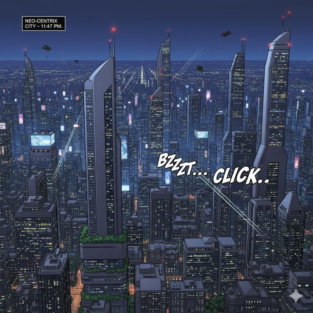 "Neo-Centrix City – 11:47 PM. The heartbeat of the metropolis stutters. Darkness isn't falling naturally; it's being installed, block by block."